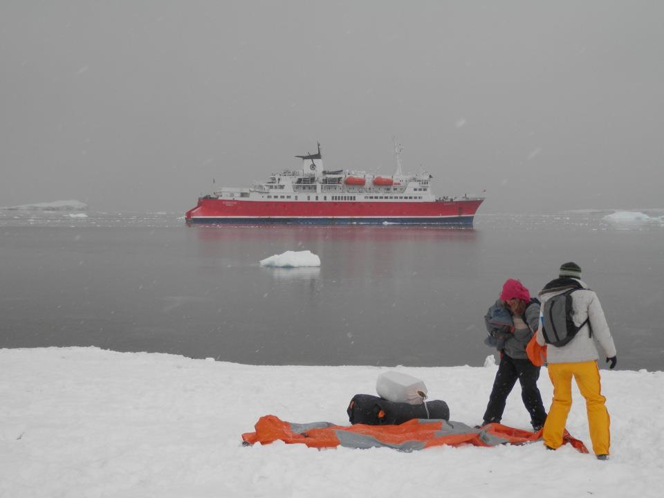 At 5.30 am on Neko Harbour we received our wake up call. After a struggle to get the rubber boats back on Ben and myself took down the tent in near record time. The penguins seemed fine but the campers were very cold. We quickly went to the landing site to wait for the zodiacs to come and pick us up. The 10 minute wait seemed like an hour during which time most feeling in my feet had gone. The warmth of the ship was welcome as was the hot shower. How explorers survive weeks camping in Antarctica I have no idea!