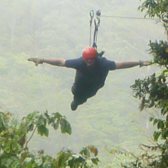 Zip-Lining in Costa Rica is basically going from tree to tree using cables and support harnesses to get there. You have to use one hand to control your speed by gripping the cable behind your pulley and the other to control you harness. You cross your legs to help stop you swinging around on your descent.