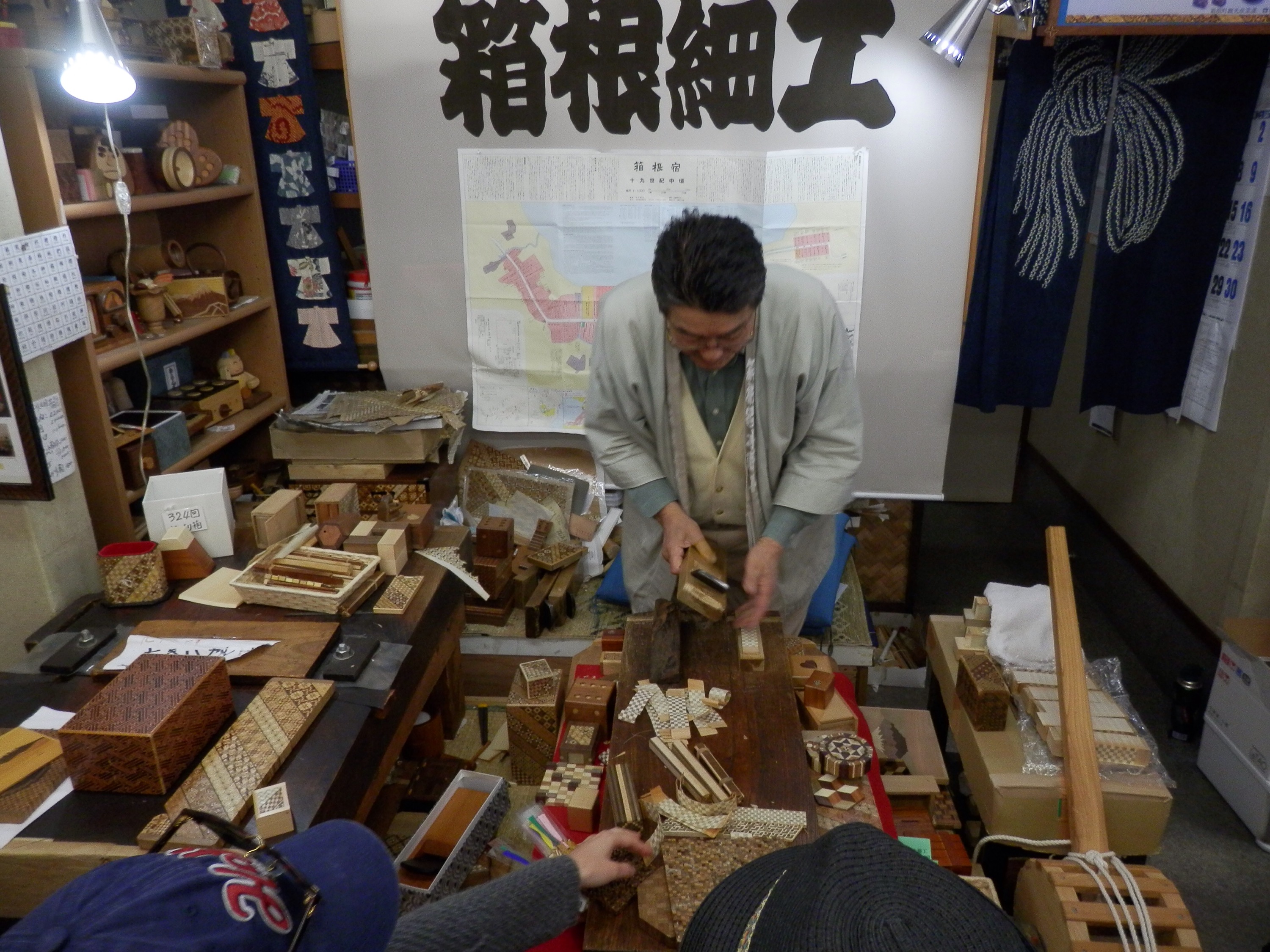 Making a lock or puzzle boxAnother bus ride got us to Hakone Gore Park, well after a steep walk / climb. The park has a nice fountain, many colourful flowers and old style Japanese huts.