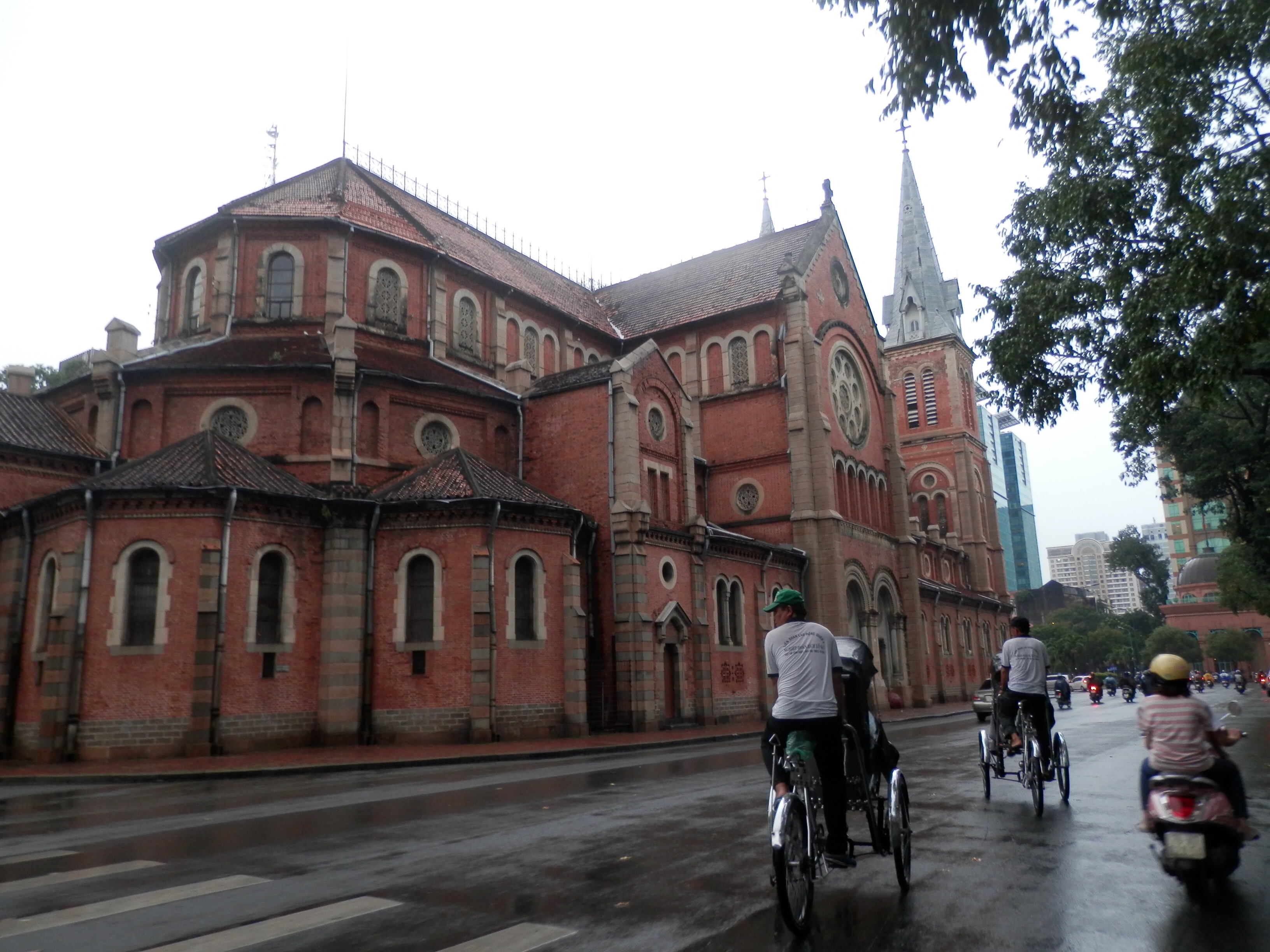 From the museum we started the Cyclo tour of the city (see video here). As it was raining we have the roof up on the rickshaws, obviously the hard working riders had no such protection. I found that my rider, unlike the rider in Hanoi, wasn’t very talkative but was still a skilled rider. We made two important stops on the tour, the first to the Independance Palace and the second at the location of a Catholic Church and magnificant Post Office.