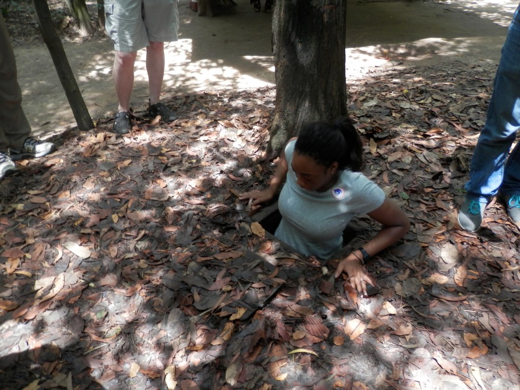 Sarah getting in a Cu Chi TunnelThe Cu Chi tunnels were used by the North Vietnam Communists and their supporters in the South. Officially the Vietnam War in this country is call the USA War of Agression (1964 to 1975). Seeing how the Viet Cong choose to live and fight you really get an appreciation of why the USA lost this war. The Viet Congress just wanted to win more.