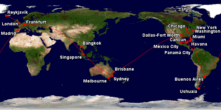 Back in 2012 I undertook an amazing trip which saw my on 24 flights with 10 airlines across 17 legs which was 76,155 km in the air or 114 hours 45 minutes I visited 19 countries over 139 days. Countries (in order): Singapore; Malaysia; Thailand; Germany; England; Spain; Iceland; Chile; Argentina; Antarctica; USA; Mexico; Cuba; Belize; Guatemala; Honduras; Nicaragua; Costa Rica; and Panama.