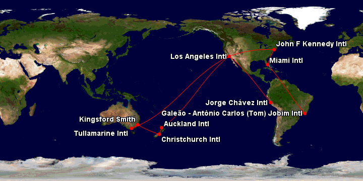 To do this we went on nine flights (across 5 travel legs) and four airlines (QANTAS, LAN Airlines, American Airlines and Jetstar). We flew 20,753 km and where we the air for 59 hours 55 minutes .