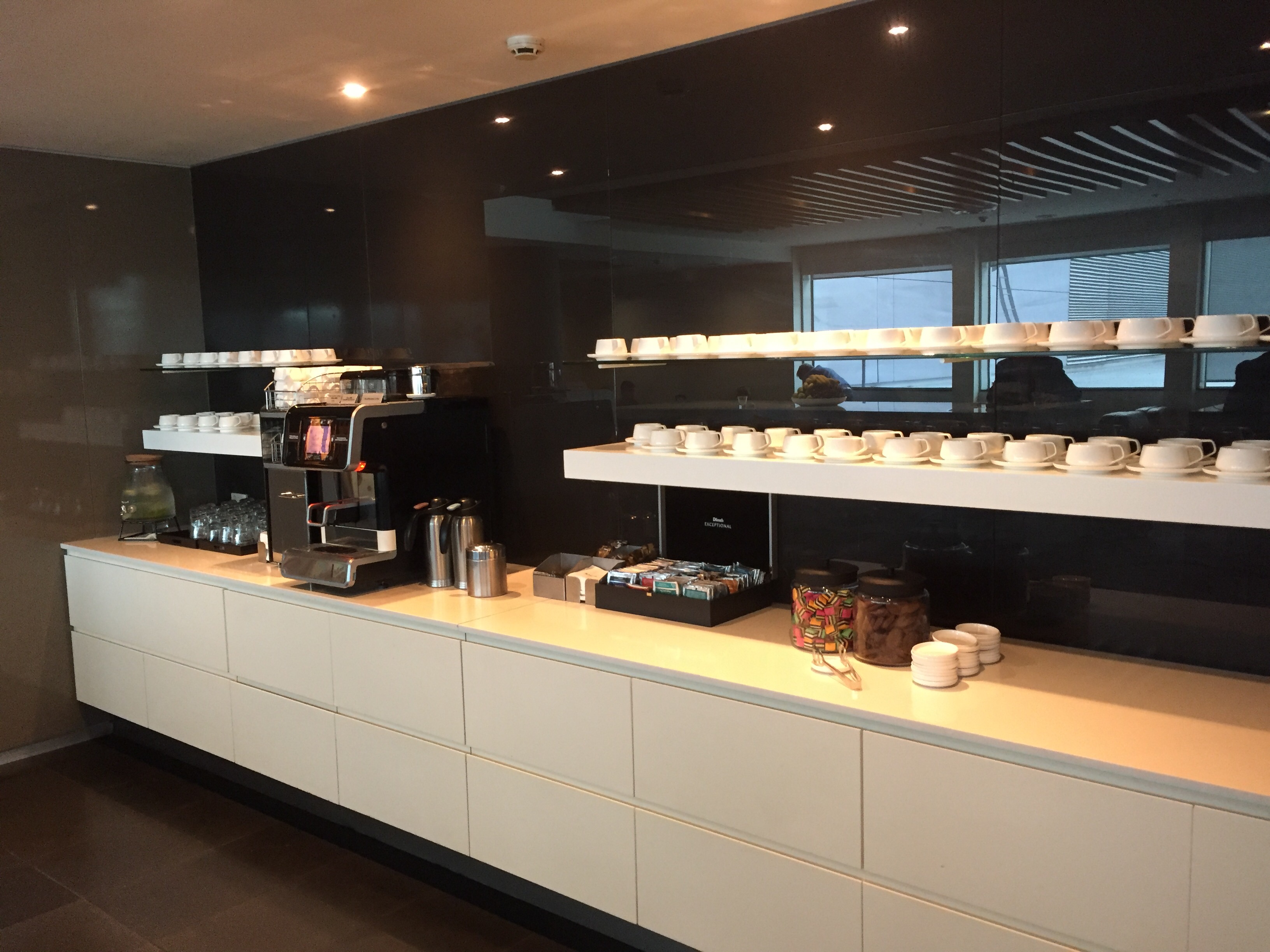 There is an all-day barista coffee service (very popular even when lounge is almost empty), juices, soft drinks, tea and water. The bar for alcohol doesn’t open until noon but offers good selection of wine, beer and spirits.