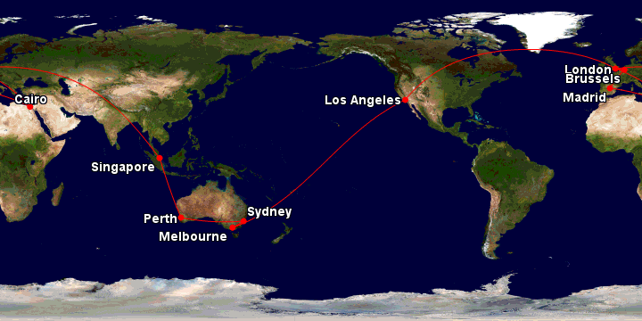 To do this I flew on ten flights (across 6 travel legs) and three airlines (Qantas, British Airways, Iberia). I was flying across 48,858 km for 62 hours 15 minutes.