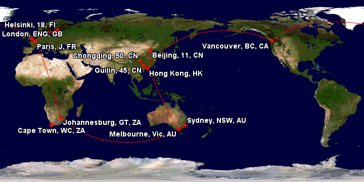 To do this I flew on twelve flights (across eight travel legs) and seven airlines (Qantas, Comair, British Airways, Finnair, Cathay Pacific, Air China, Xiamen Airlines). I was flying for 54,031 km and 73 hours 20 minutes.