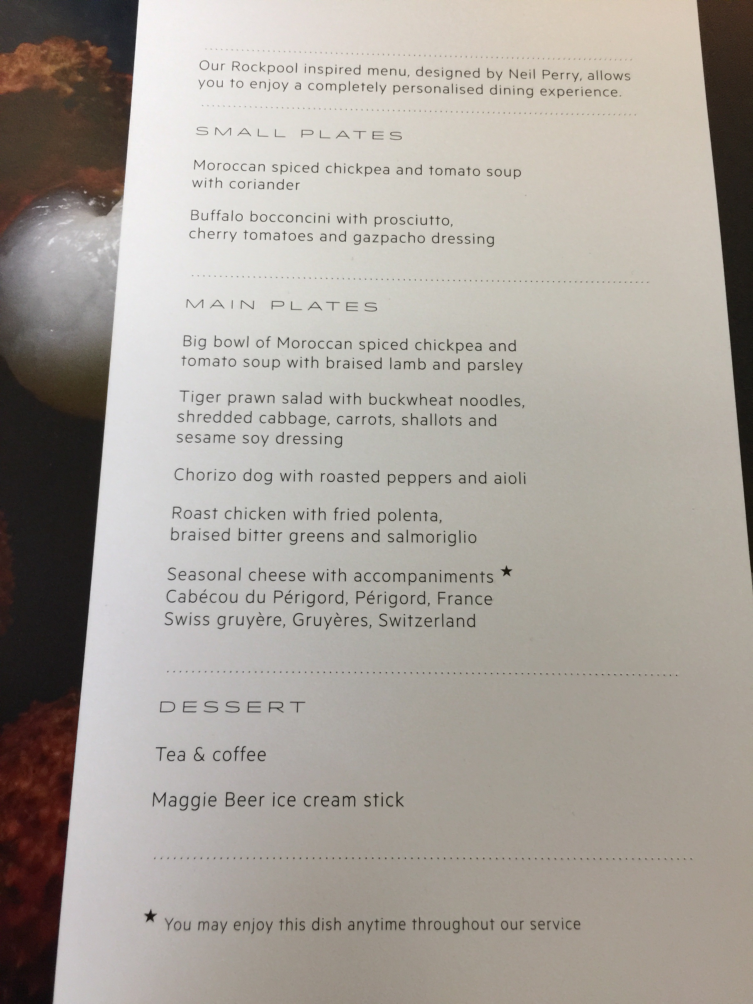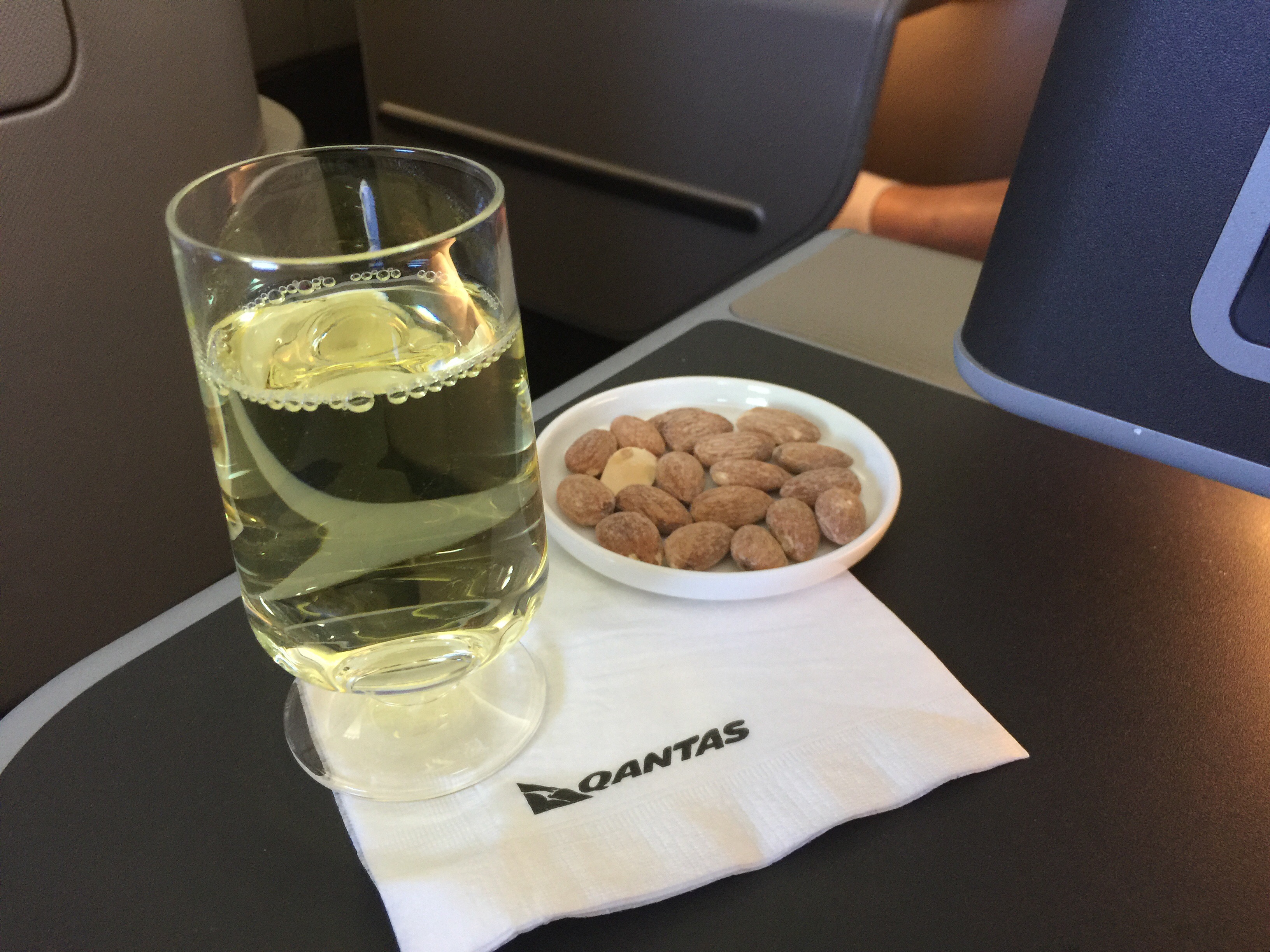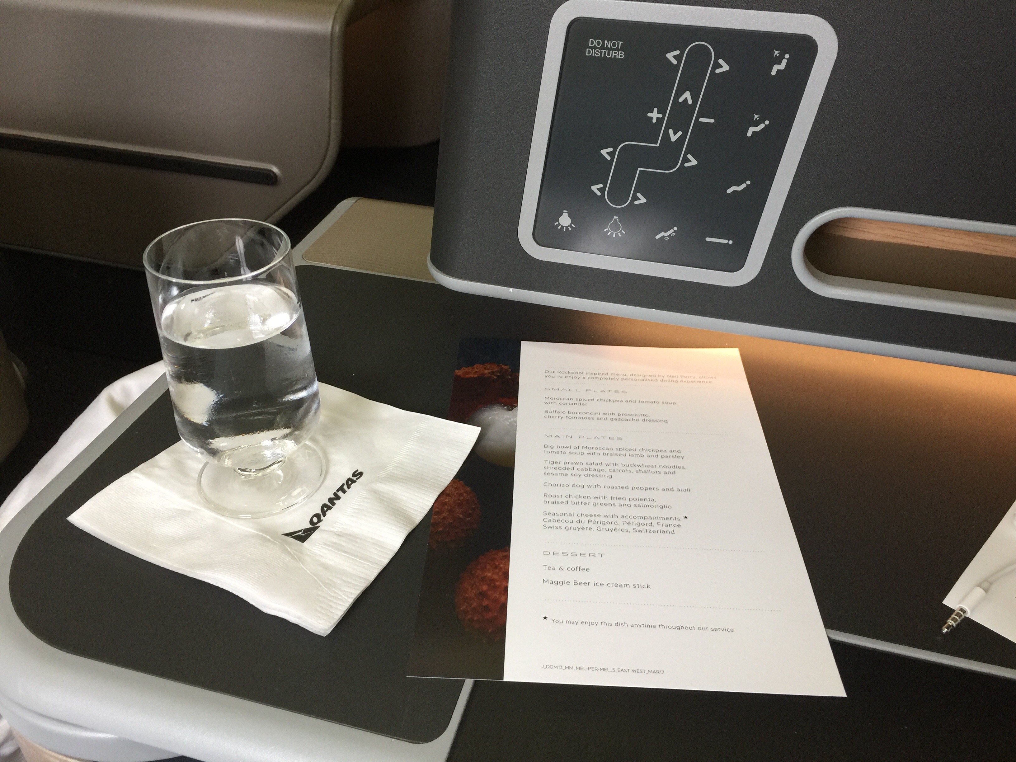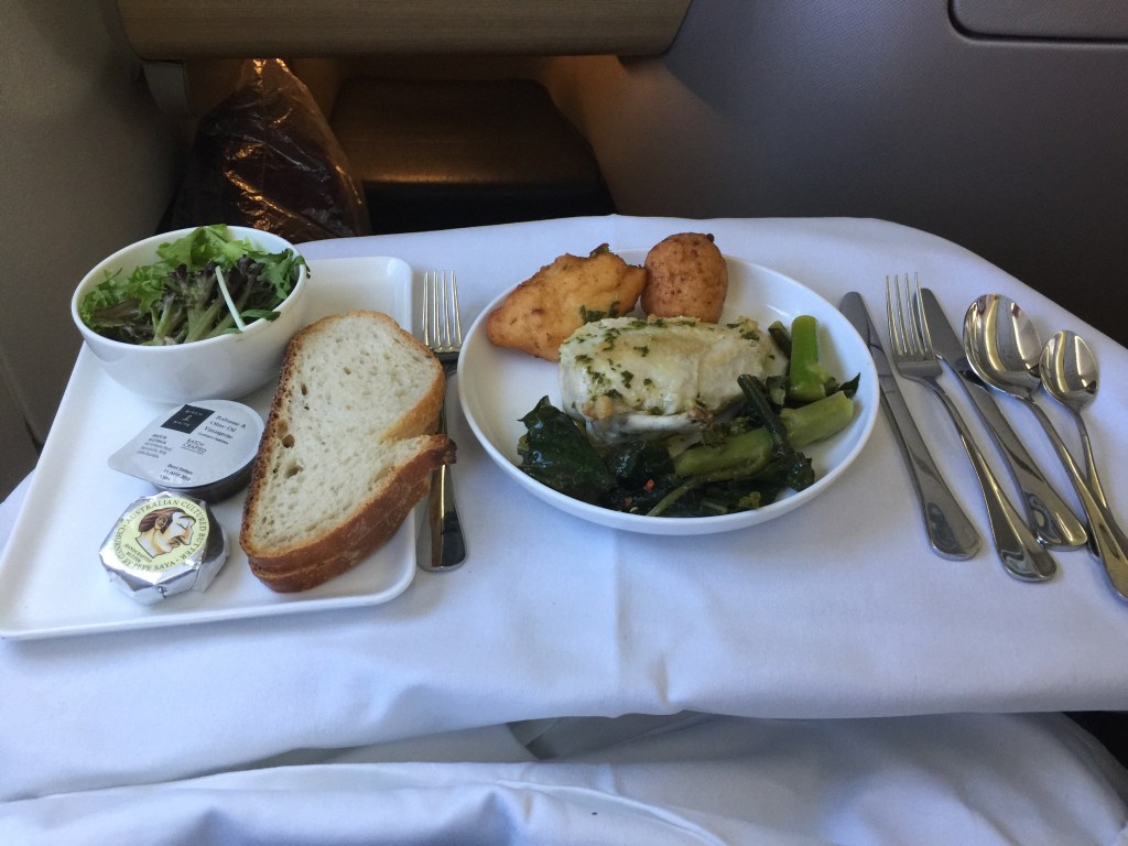 As we were departing at lunch time we were quickly served, first with another drink service, which I selected a white wine and was provided some nuts, and than second with the meal service. Business Class passengers are offered an entree, main and desert food options. I skipped the Entree (options Moroccan spiced chickpea and tomato soup, or Buffalo bocconcini with prosciutto) having eaten a light but late breakfast in the Qantas Business Class Lounge.