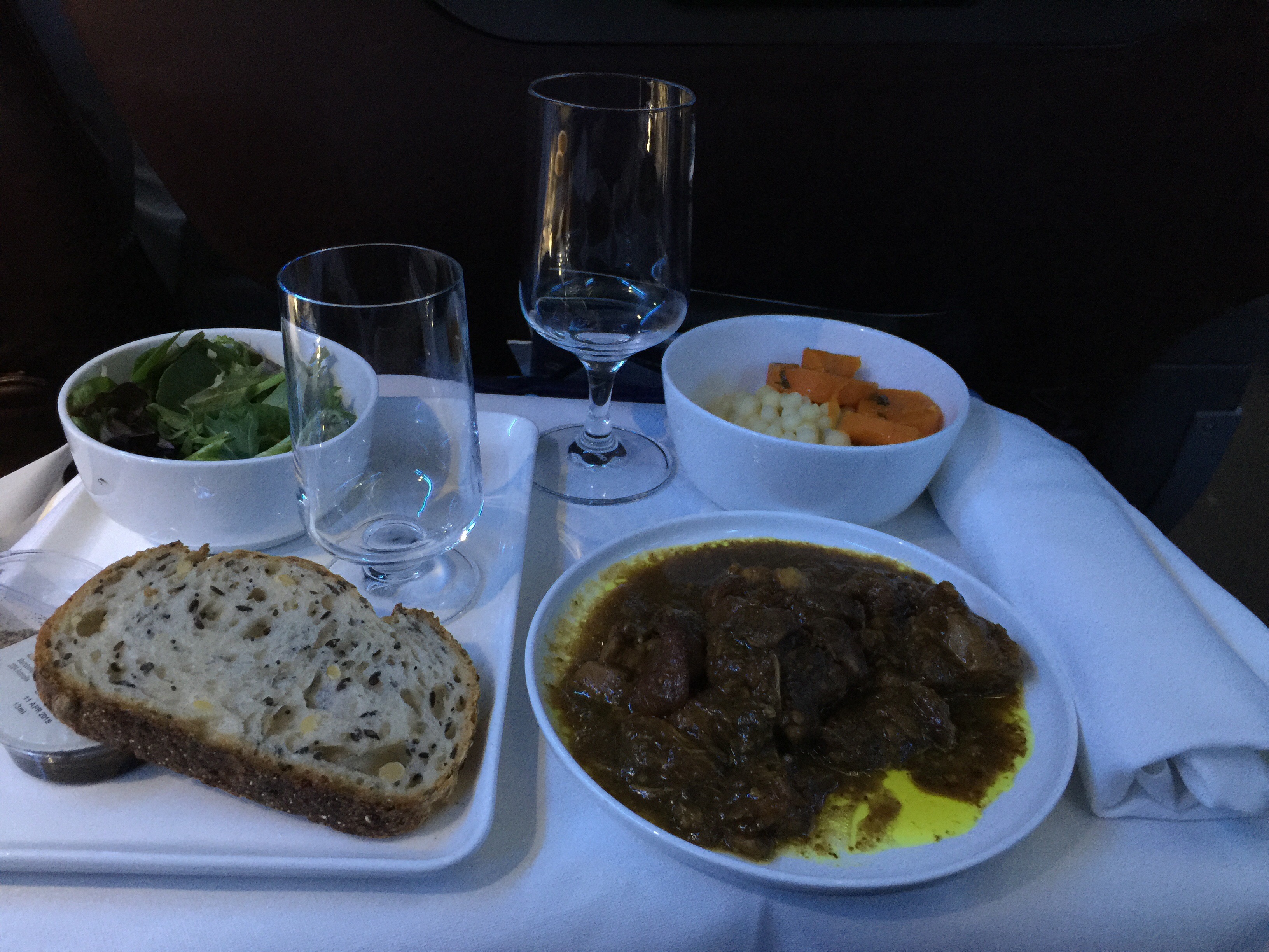 Cinnamon and walnut braised chicken with saffron carrots and couscousAbout 40 minutes into the flight the meal service commenced. I skipped entree / small plate having eaten in the lounge. For my main I selected the cinnamon and walnut braised chicken with saffron carrots and couscous. I selected Coke Zeros during and after the meal.