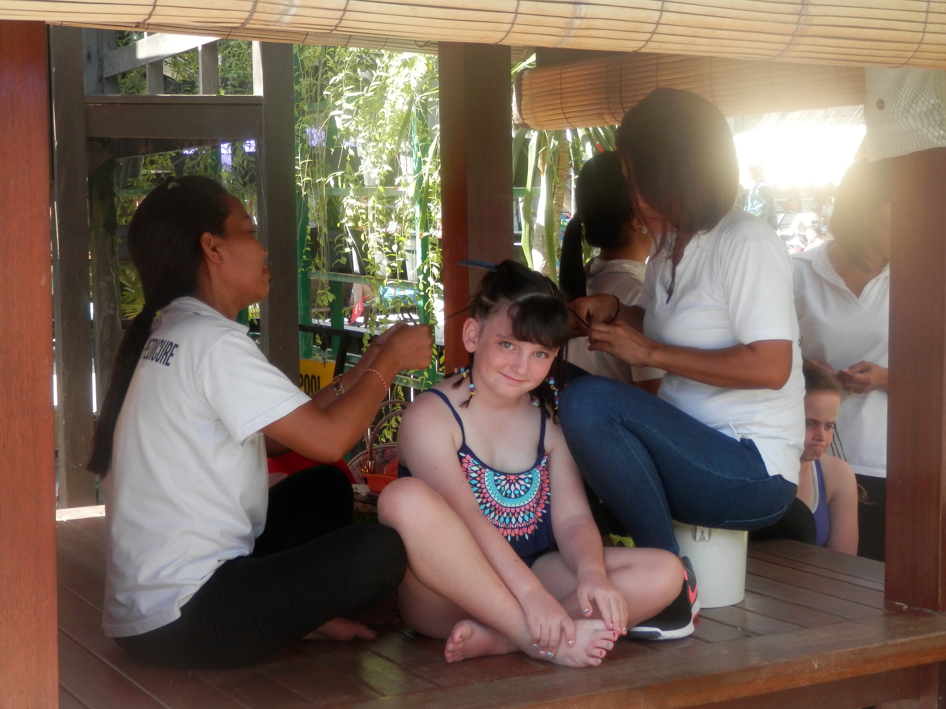 Erin’s hair braidingThe early afternoon was about the pool for the Lana, Kara and the kids. Lana even went on the giant water slide but had to prove this to Darby by showing us photos! Meanwhile Darby and Erin got their much wanted hair braiding although they didn’t have much fun getting it done 🙂