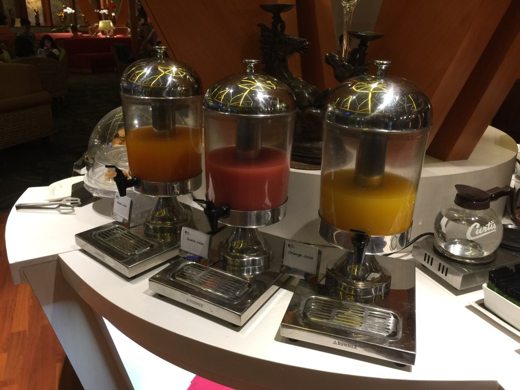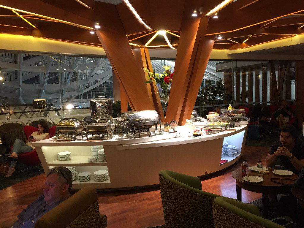 There are two food stations located in the lounge area. One mostly for cold food (sandwiches, cold mini burgers and cakes), and the other one for a mix of cold and hot food (rice and chicken). There is a station for juices, a self serve fridge with soft drinks and beers, plus a bar service.