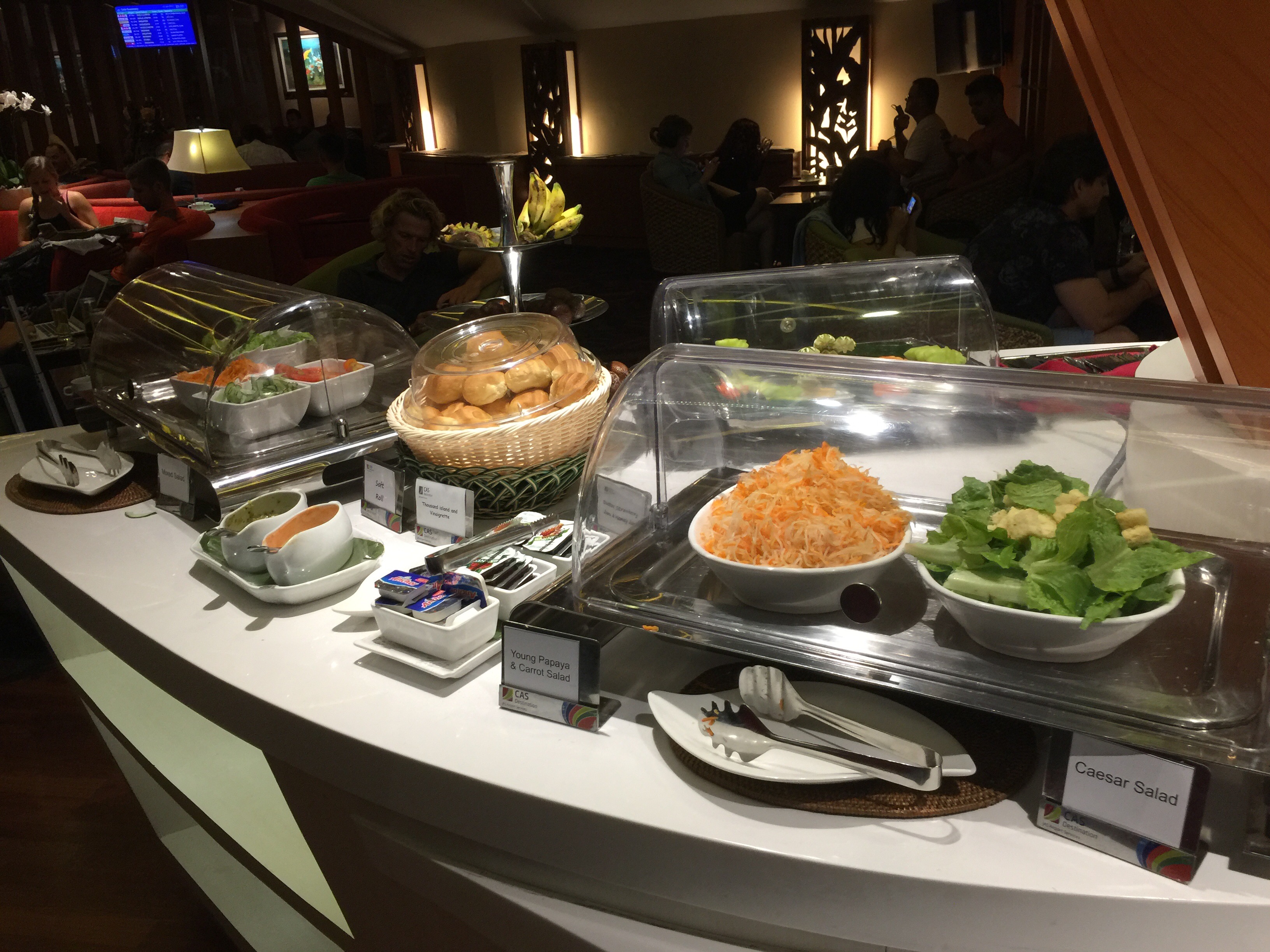 There are two food stations located in the lounge area. One mostly for cold food (sandwiches, cold mini burgers and cakes), and the other one for a mix of cold and hot food (rice and chicken). There is a station for juices, a self serve fridge with soft drinks and beers, plus a bar service.