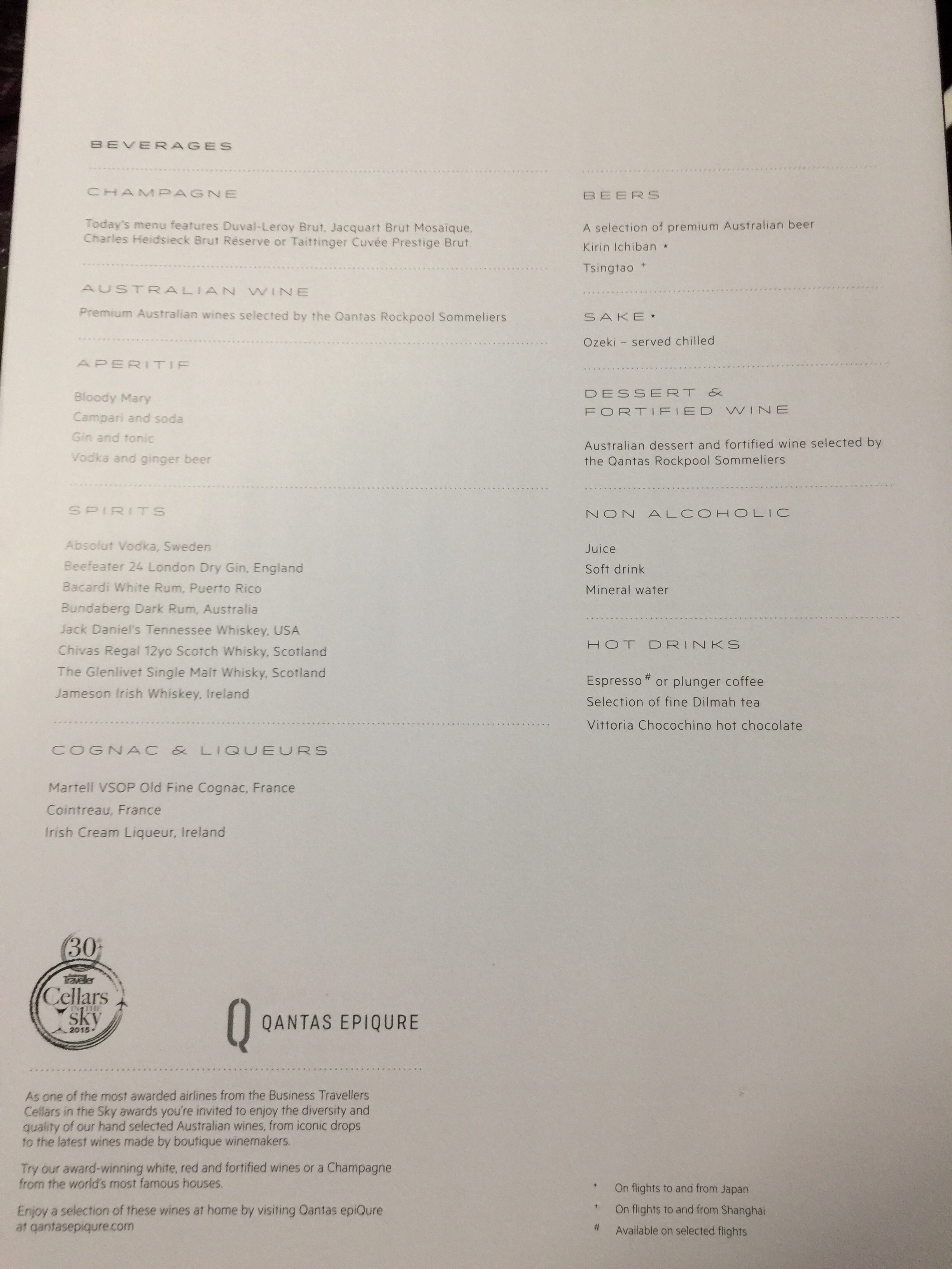 QF044 Business Class – Drinks MenuWe were provided the amenity kits after the main meal compare to the flight over when provided immediately after the plane leveled off. The kit included an Aurora Relax and Hydrate Travel Essentials kit (Hand Cream, Face Moisturiser, and Lip Balm), toothpaste and brush, travel socks, face mask and ear plugs. The face mask was welcome for this overnight flight.