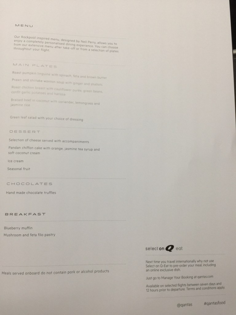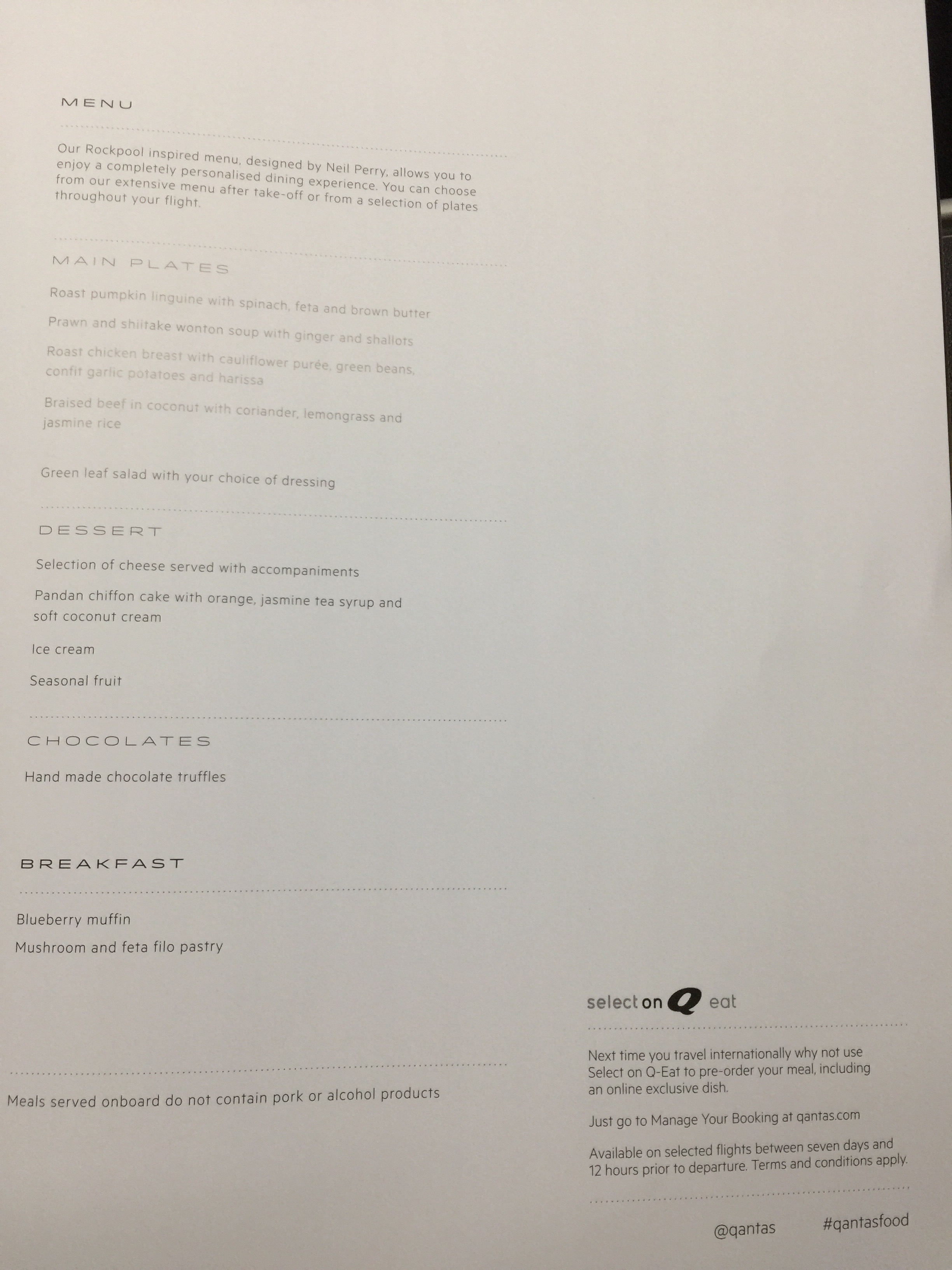QF044 Business Class – Amenity KitThe entertainment options were the same as coming over to Bali making for a limited selection since the only movies loaded after New Release instead of New Release and Classic. I watched the engrossing ‘Hidden Figures’ based on real events of black women who worked at NASA during the 1960s.