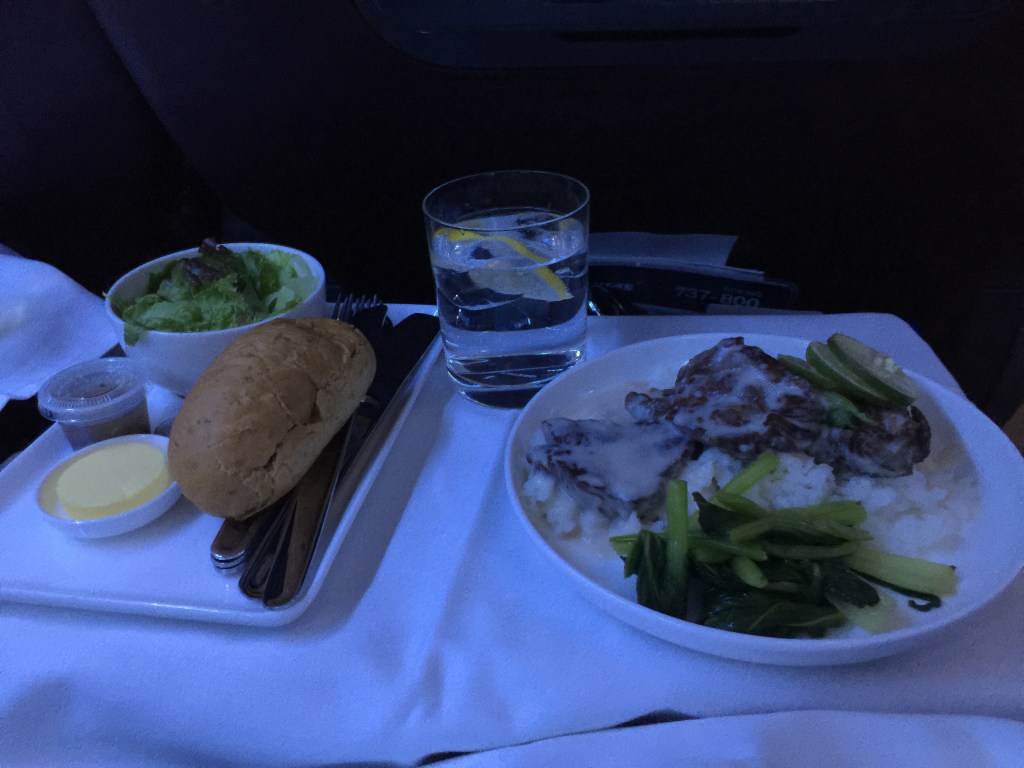 Dinner – braised beefThe meal service commenced in business class at 23.27 of 51 minutes after the plane had levelled out. There was no entree / small plate offered (I won’t have selected anyway) but we did get roasted cashews & pretzels. I selected the braised beef in coconut with coriander, lemongrass and jasmine rice. I decline the dessert options and selected lemonade to drink during and after the meal.