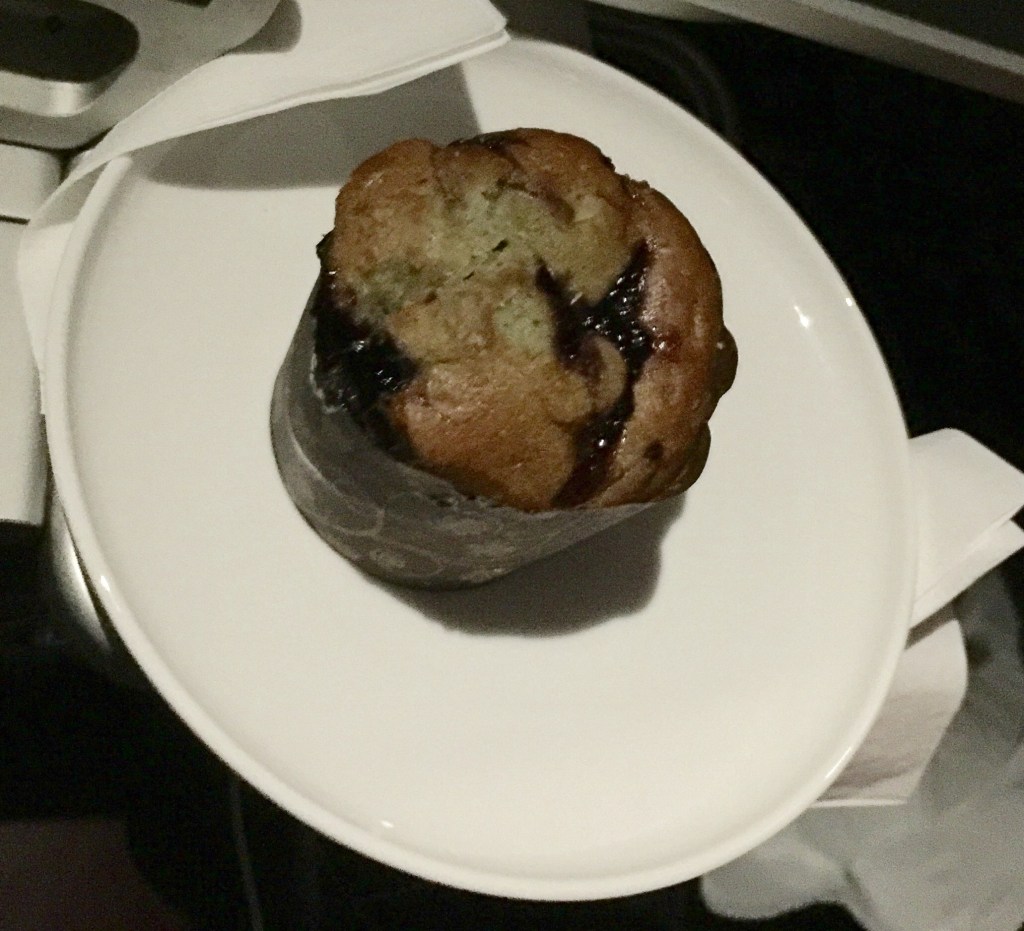 QF044 Business Class – Breakfast Blueberry MuffinI selected the Bluberry muffin for breakfast which was service 50 minutes out from landing.