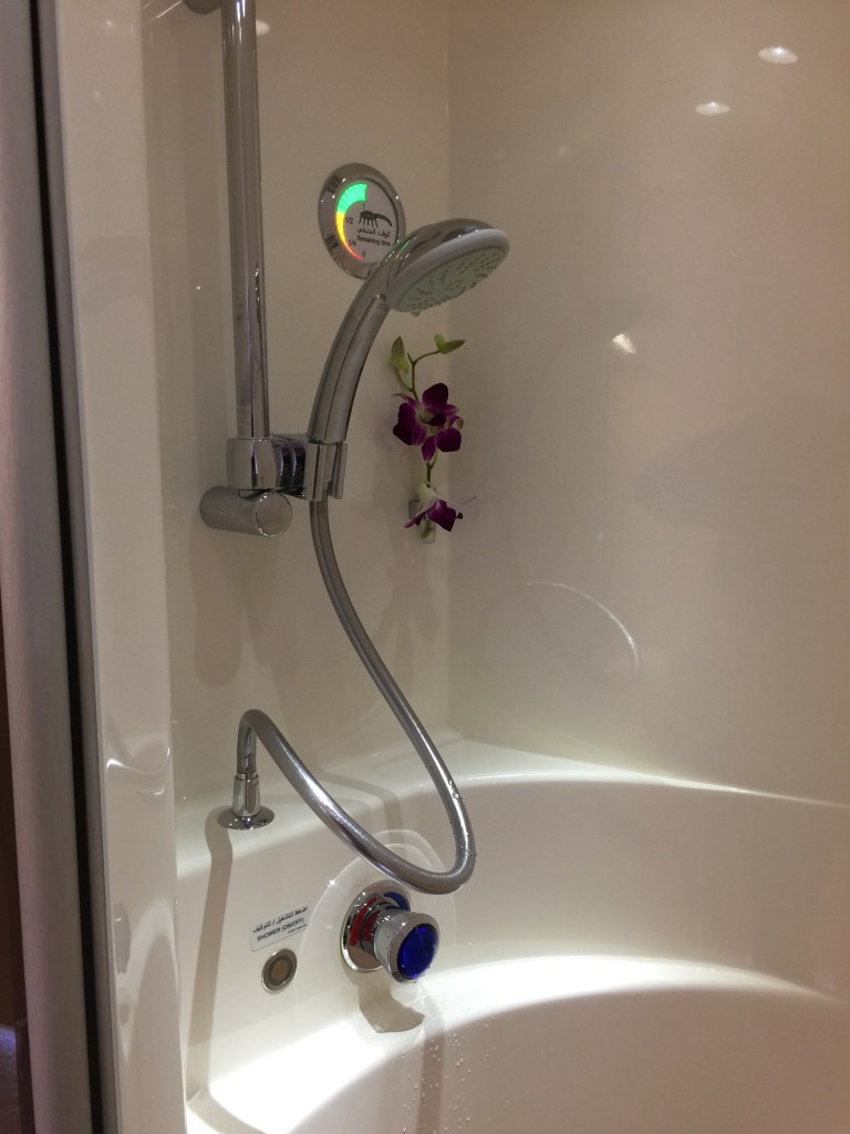 Next up was the shower experience. While I’d read many reviews and even watched some YouTube videos I still found it hard to believe they do this at 40,000 feet. My hostess provided me with a quick tour of the facilities. You get the bathroom for 25 minutes with 5 minutes of water. You can stop the water at any time and it automatically stops with 1 minute to go as a warning to start finishing up. Additionally the bathroom floor was heated and they was more types of lotions than I knew existed. This was heaven for a former backpacker used to the economy squeeze. Short 1 minute YouTube Video.