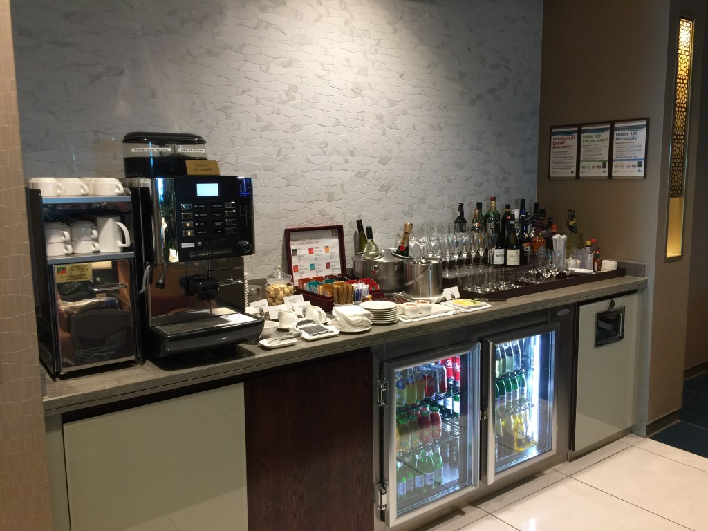There is one small service station with some very minor snacks and drinks (including alcohol) but the main game is the dinning area which has a buffet selection of food. I only tried some cheeses and a soft drink as I had already eaten in Qantas Lounge and had upcoming first class flight. The selections of food however were limited for a first class lounge. All food is halal. The drinks however are much more extensive.