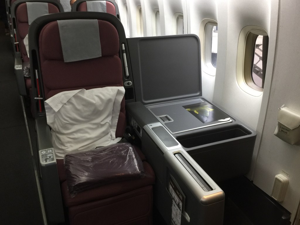 I had allocated seat 5B which was the first seat after entering via the business lane. This allowed me to hold a discussion with the flight attendant at the door while she was waiting for other business passengers. This seat is both a window and aisle exit row seat. The business class seats are the fully-flat Qantas Skybed II seats with the following specifications: 60.9cm (24in) bed width, 203.2cm (80in) seat pitch and bed length, back massage function, leather armrests and 30.7cm (12.1in) in arm entertainment screen.
