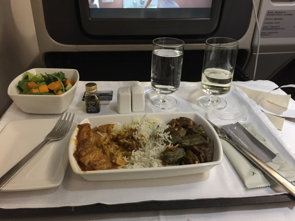 The meal was served 15 minutes after takeoff. The starter was Gravlax salmon with sweet potatoes and a mixed salad and bread. I selected to have the Wairau River Sauvignon Blanc 2017 to go with the meal. I selected the Murgh Badami, dill pulao and Masala bindi (chicken curry with basmati rice). The meal finished with an ice cream. The food was good (in particular the salmon, but I was very full from the earlier lounge visits).
