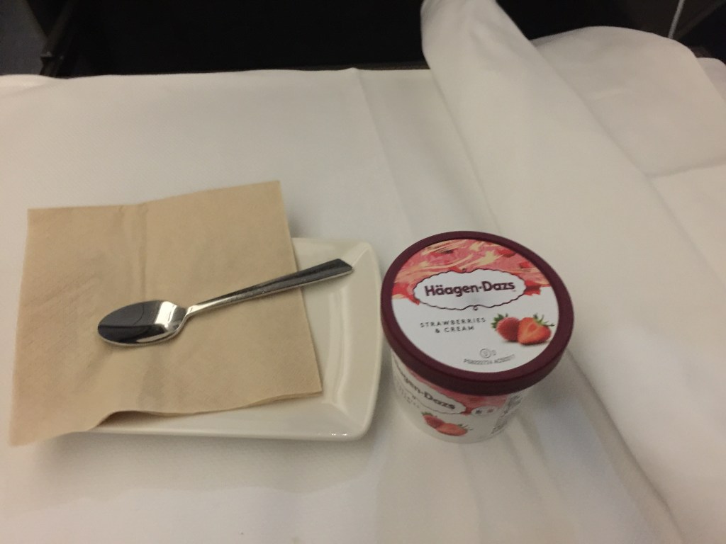 The meal was served almost immediately are plane reached cruising altitude. The meal included some season fruits, and I selected the stir fried fish, spring onion, Park Chou, fried vegetable noodles (lovely) and strawberry Haagen-Dazs Ice-cream.