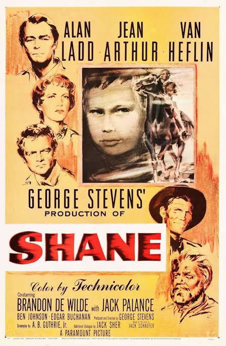 Cast: Alan Ladd (Shane), Jean Arthur (Marian Starrett), Van Heflin (Joe Starrett), Brandon deWilde (Joey Starrett), Jack Palance (Jack Wilson), Ben Johnson (Chris Calloway), Edgar Buchanan (Fred Lewis), Emile Meyer (Rufus Ryker), Stonewall Torrey (Elisha Cook Jr.)