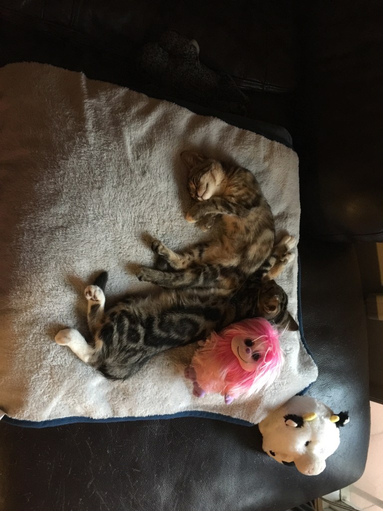 Today Juno has already jumped into my arms for a cuddle. Boots has already given me three head ‘bunts’ telling me that I’m part of his family. We have all played together, they have played with each other, wrestling around their toys, they have run around the apartment playing tag. Right now they are sleeping together.