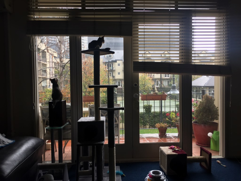 Over the next few weeks Juno, Boots and me worked out each other’s patterns. Boots was adventurous, always wanting to play and regularly overcommitting and falling off my bed trying to catch a toy. Boots also run out into the stairwell every chance he had. Juno was more cautious always taking time to work things out but still ready to play. Juno turned out to be an up high cat climbing to locations I didn’t think were possible. They loved the cat tree, surveying their domain. They loved everyone who walked in the door, a new person to play with and get attention from.
