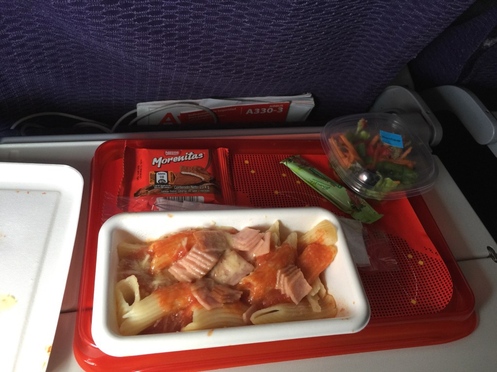 In economy class you are not offered any drinks before departure. The flight offered lunch. The meal service commenced 14.31 with option of either beef or pasta (I selected beef). Served with a small salad and Nestle Morenitas.