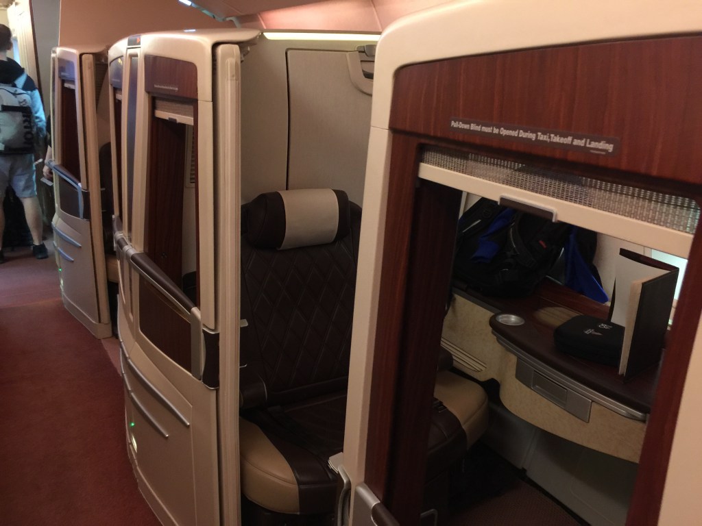 Singapore Airlines A380 First Class seats are arranged by two rows of 1-1 (no centre seats) and two rows 1-2-1 with 12 seats overall. The first class seats, or suites, are massive.