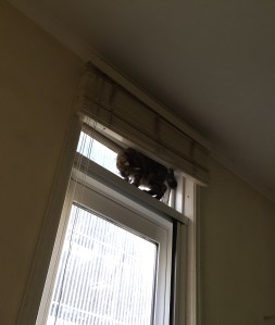 Every day when I get home between 4 pm and 7 pm I see Juno on her cat tree looking out and when she spots me she gets very excited and quickly jumps down to greet me at the front door. Boots is always there to greet me as well so I can only assume she is the lookout for them both. The greeting when I get home is very welcome. Boots stretches up with his full body to get as close to my face as he can, right now he reaches my belly button and I can usually hear his purrs as I give him a welcome home head and back scratch. For Juno it’s normally a welcome home leg rub. They seem very happy when I get home.