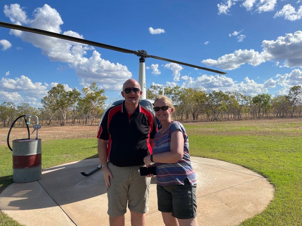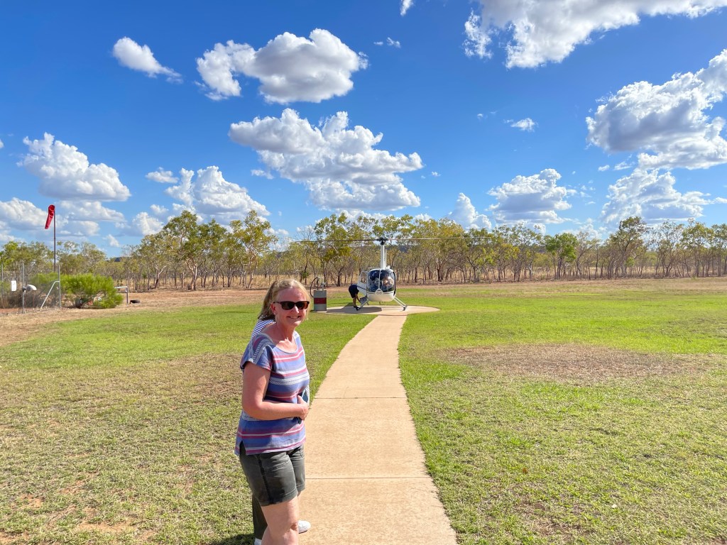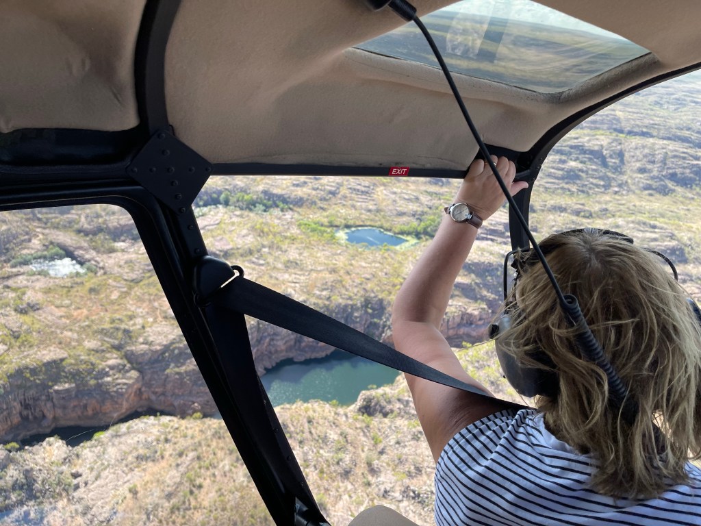 At 2 pm we arrived at Katherine and with our excursion option passes in hand we headed off to the Nitmiluk Heli-Touring Scenic Flights. On check in they weigh you and you then get assigned to your flight. The helicopters were 4 seaters, 1 for the pilot and 3 for passengers with 1 passenger in the front. The front two seat don’t have a door so you are directly feeling the elements.