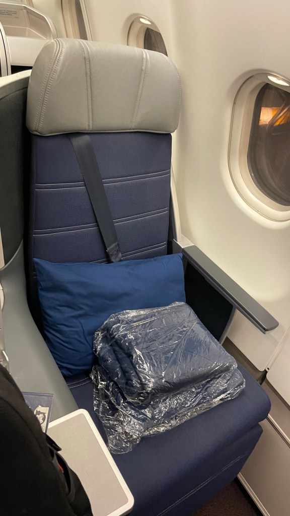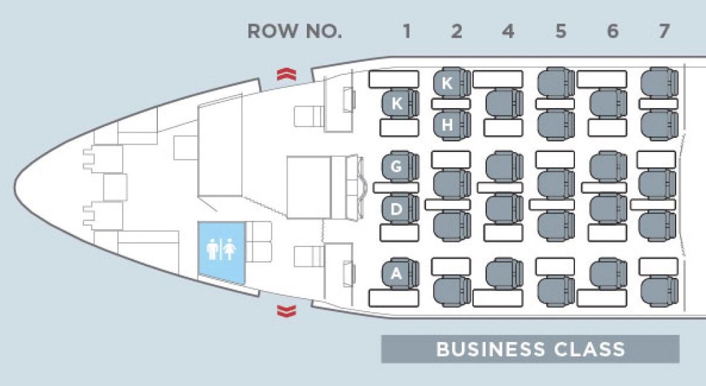 There are 27 seats in business class, configured as either singles or pairs with the rows alternating between a 1-2-1 and 1-2-2 layout. I had selected the left hand side of the plane (single seats A) and choose row 2 as that seat is closer to the window with store on my right side.