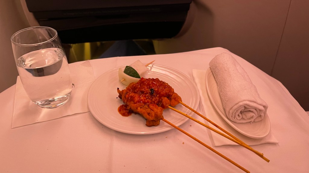 There was a ‘refreshment’ meal offered 40 minutes into the flight of Chicken Satay with a drink (I choose water).
