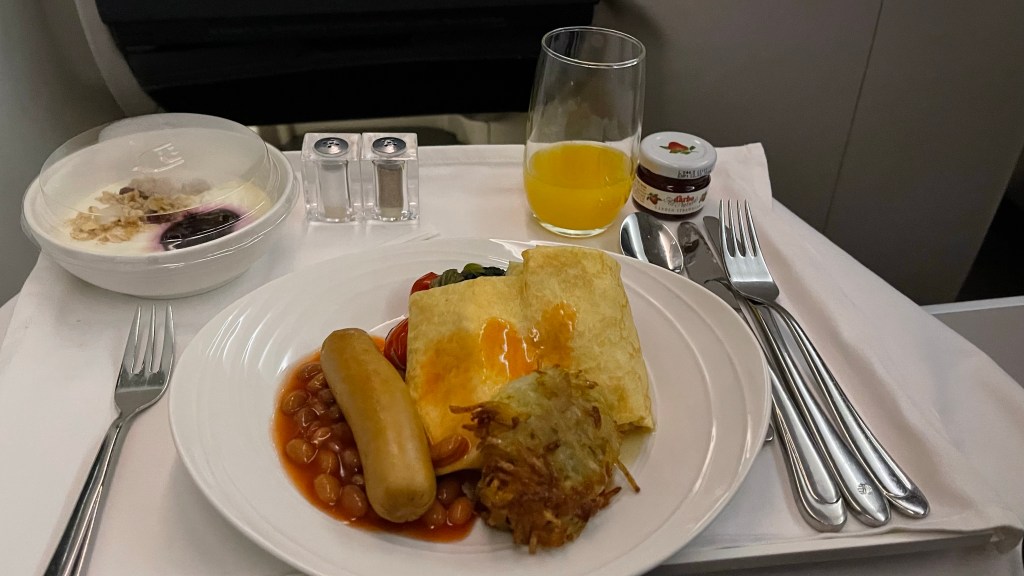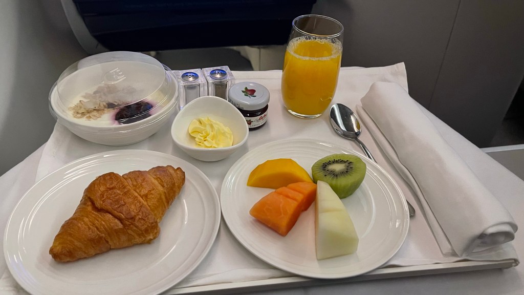 The main meal was the Breakfast service which commenced 2 hours before the scheduled arrival. The service started with a fruit selection plus a selection of croissants and toast (with butter and jam spreads) and an orange juice. I then selected the ‘Stuffed Crepe with Scrambled Eggs’ option with also came with a chicken sausage.