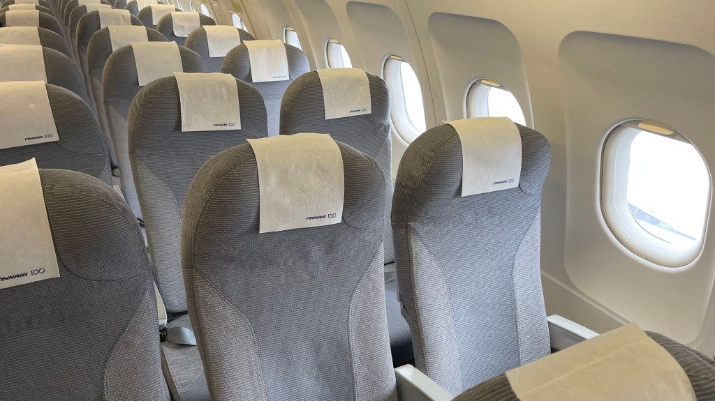 This Finnair A320-200 aircraft operates with all economy class seats with 168 seats in total. The first 4 rows are allocated as the “business class section” with the middle seat not used reducing total number of bookable seats to 160. Rows are in a 3 – 3 layout. There was not one passenger in the ‘business’ class section. Darby was allocated row 5 seat A meaning she was the forward most passenger on the plane. I was in 6A behind Darby so we both had window views.
