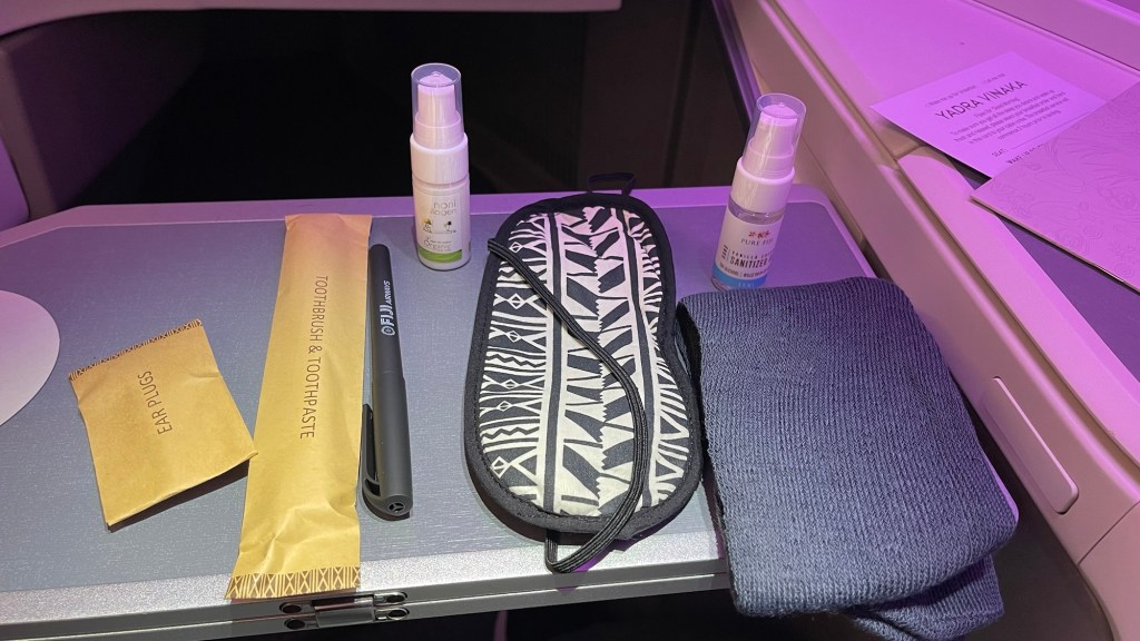 An amenity kit was provided which included; hand sanitiser, organic nut oil, a pen, socks, ear plugs, a toothbrush and toothpaste.