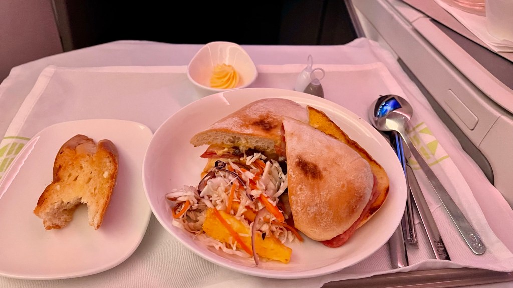 For dinner, I selected the main: Champagne Ham and Cheese crusty ciabatta roll with garlic bread. Desert: Fijian Purini. Drink: Coke Zero.