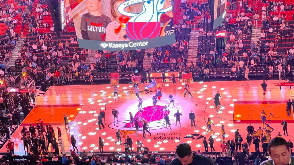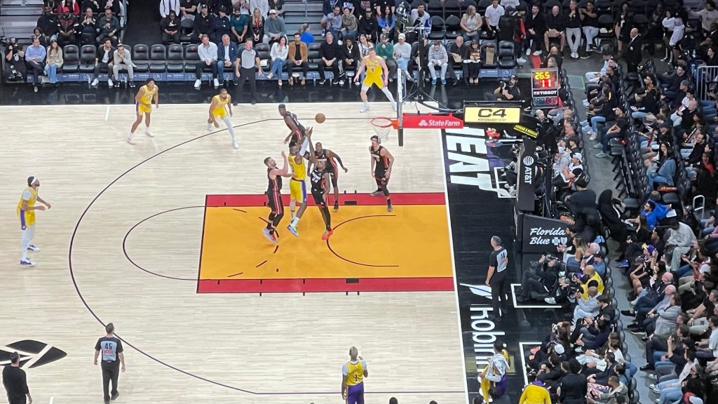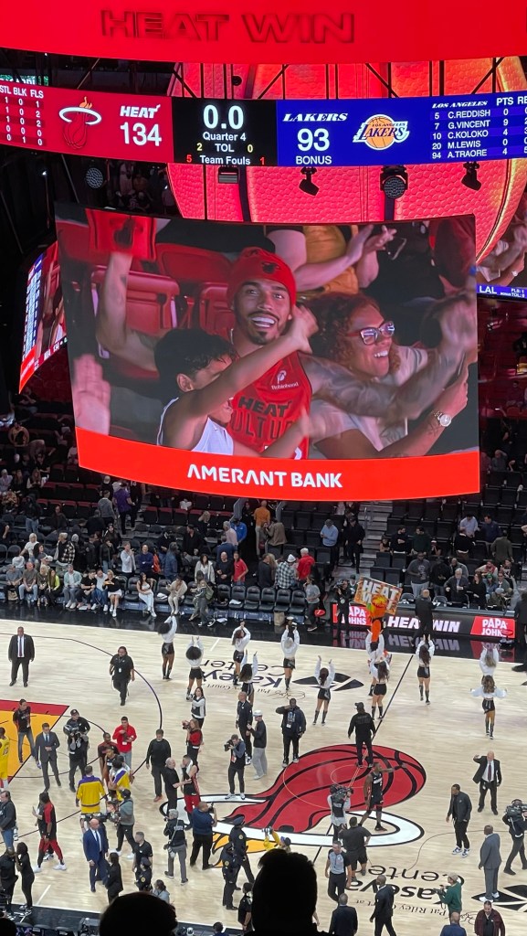 While the game itself wasn’t close, with Miami Heat 134 beating LA Laker 93, we got to watch Lebron James (LA), and some great plays, in particular Tyler Herro hitting multiple 3-pointers from a long way out and scoring 21 points in the third quarter alone. An unforgettable energetic experience.