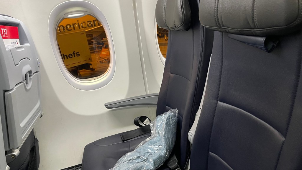 The American Airlines Boeing 737 Max-8 is a single-aisle aircraft. Each seat has a 30-inch seat pitch. There are 172 seats in 3×3 rows, each with power, a tray table, and an adjustable headrest.