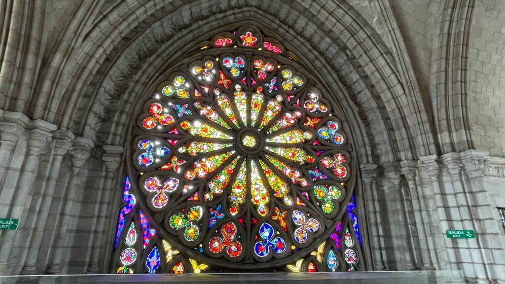 Probably the highlight of our time in Quito was the Basílica del Voto Nacional (Basilica of the National Vow) is the largest neo-Gothic basilica in the Americas. The climb up inside the Basilica first stopping at the magnificent Rose window. We then moved up to the roof for a great view of Quito. Erin climbed even higher for a better view.