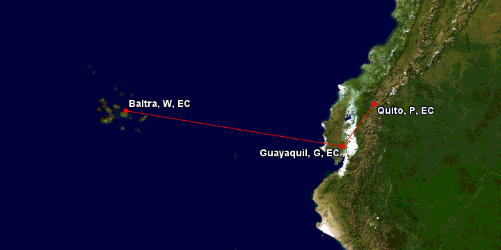 This flight had two legs, commencing from Mariscal Sucre International Airport (UIO – Quito, Ecuador) with the final destination Seymour Galapagos Ecological Airport (GPS – Baltra Island, Ecuador) via José Joaquín de Olmedo International Airport (GYE Guayaquil, Ecuador).