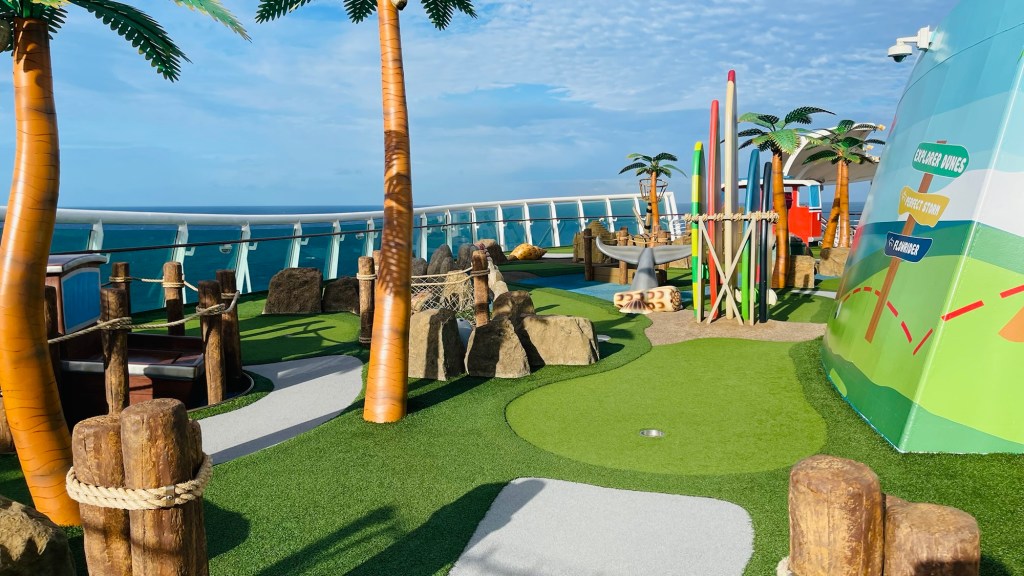After breakfast, I went out to explore the ship more. This time I went to the back of the ship and found the games area which included the WaveRider, slides, table tennis, video game machines, multi-purpose sporting courts, and mini golf. I played 9 holes of mini golf and finished -3 which I consider a good score in the wind.