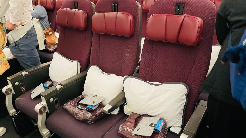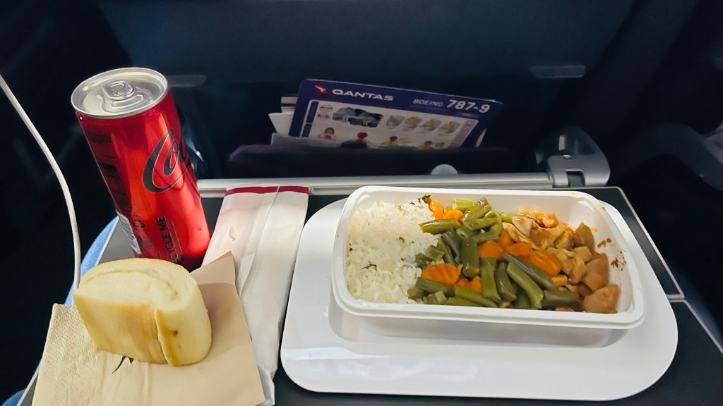 This Qantas Boeing 787-90 has 42 Business, 28 Premium Economy and 166 Economy seats. Economy seats are in a 3-3-3 layout. The seats are 17 inches wide (43.8 cm), with the seat pitch at 32 inches (81.3 cm). I selected an aisle seat in the middle 3 seats. I ended up with the seat next to me empty.