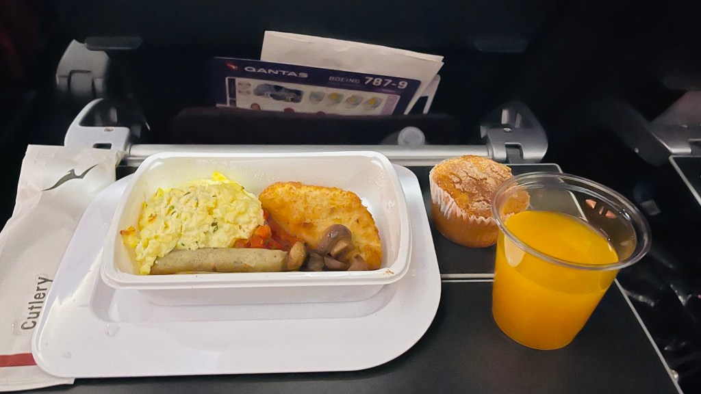 The last meal service was breakfast which started 2 hours before landing (14 hours 30 minutes into the flight. I selected the scrambled eggs with chicken sausage, hash browns and mushrooms, lovely. The other option was a fruit plate.