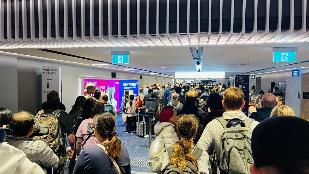 We landed at 05:20 which was 20 minutes earlier than scheduled. We disembarked at 05:38. The arrivals hall was packed and it took a while to use the kiosk for arriving Australians to answer questions and get a pass to be used at the security gates.